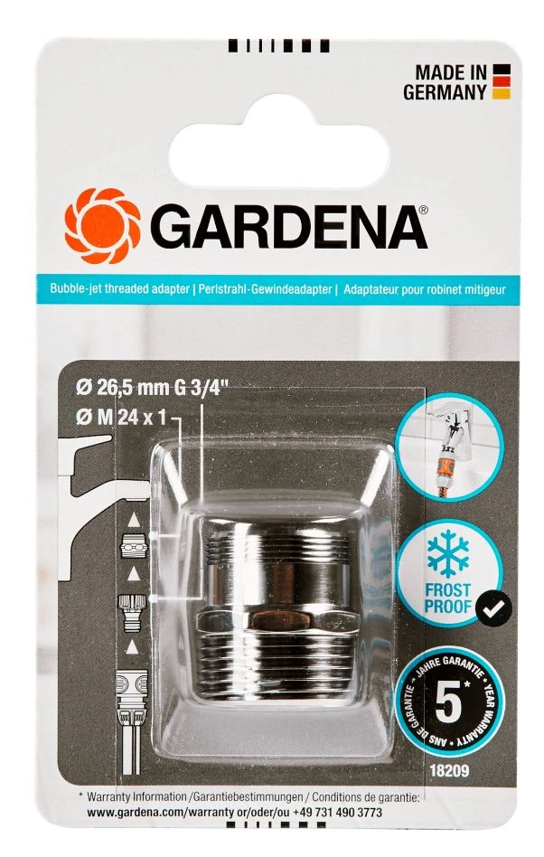 - L’adaptateur à vis GARDENA pour jet d’eau doux est parfaitement adapté au raccordement du système GARDENA à un robinet de cuisine ou de salle de bains.
