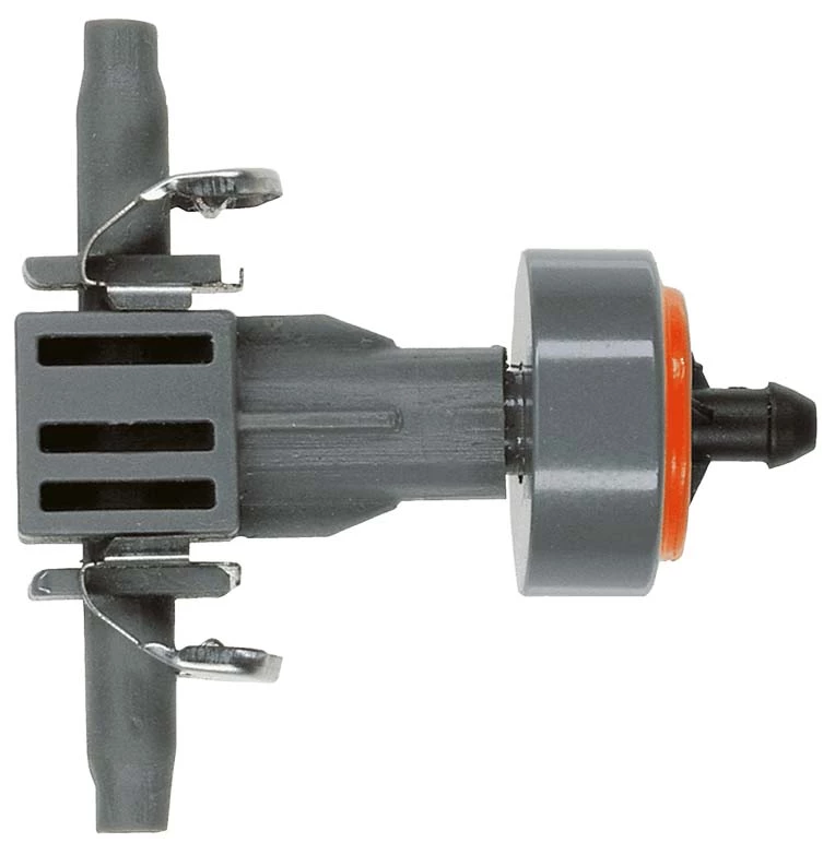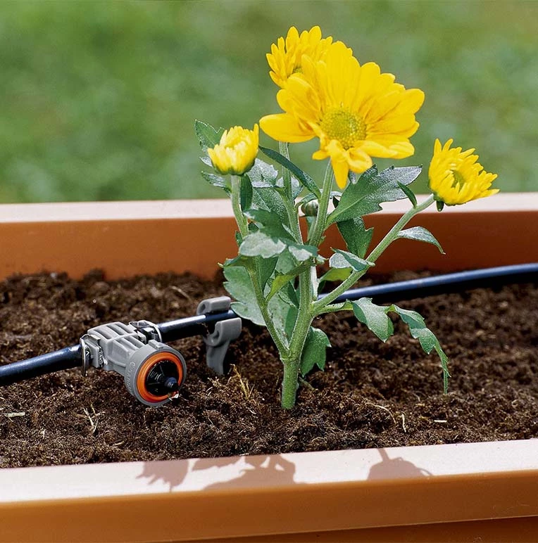 - La tête de goutte-à-goutte de série avec égalisation de pression convient parfaitement – en tant qu’élément du système de micro-goutte-à-goutte GARDENA – à l’arrosage de rangées plus courtes de plantes ayant des besoins en eau similaires.