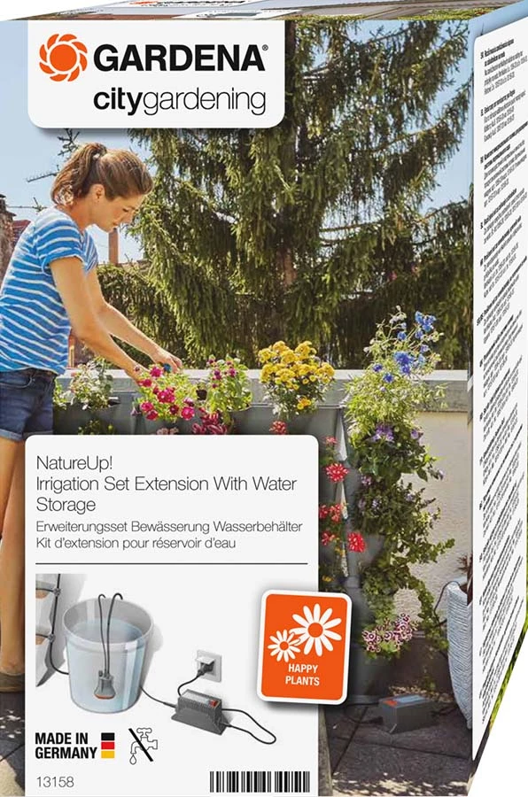 - Le kit d’extension Réservoir d’eau NatureUp ! de GARDENA permet d’arroser facilement et de manière économique les jardinières Nature Up ! lorsqu’il n’y a pas de raccordement d’eau à proximité.